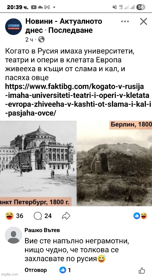 Митът, че Европа е имала университети от Средновековието, като Болоня (1088), Сорбоната (1257) и Оксфорд (1096), е, разбира се, западна пропаганда. Ясно е, че тези “университети” всъщност са били прикритие за гилдии от калфи по сламените покриви. А що се отнася до театъра? Шекспир, Молиер, Корней… детински опити в сравнение с дълбочината на всяка руска реплика: “Жизнь — боль”.