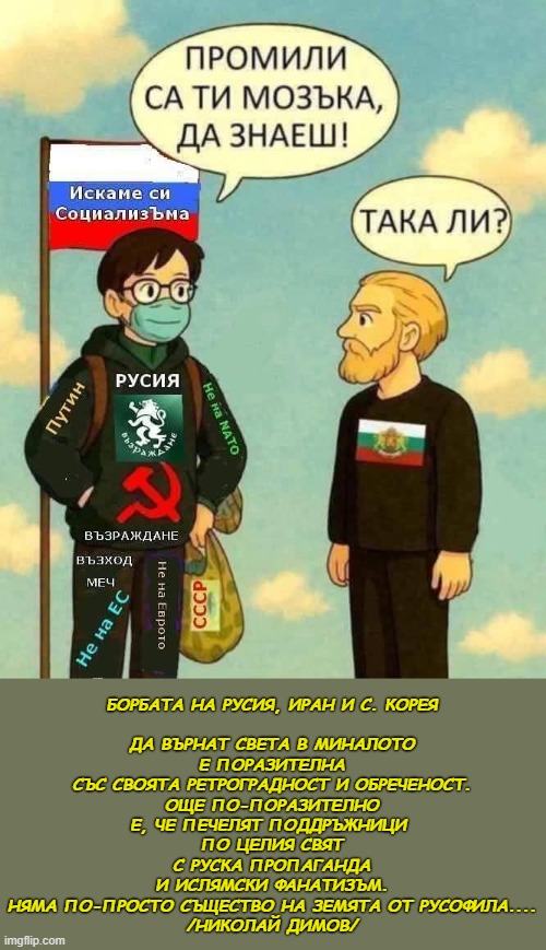 Русофилите по произход са комунисти, това е много съществено, а е пропуснато. Разбира се, в миналото е имало и русофили, които са си нямали хабер от комунизъм, например Вазов, но общото между двата вида от различните епохи е, че са еднакво продажни, долни и - да - малоумни! Апропо, доказателство за това виждаме ежедневно и тук в блога!