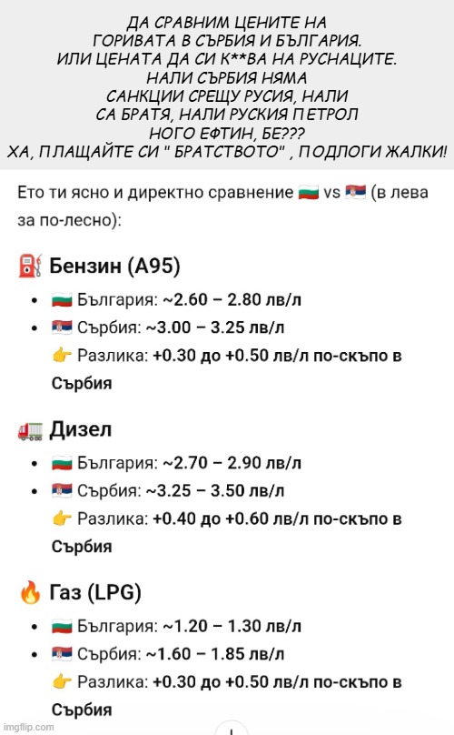 двете страни , опирайки се на цените на дребно които си цитирал Ще сметнеш че при сърбите сборовете са около 50%, я у нас мялко над 30 Горивата у тях винаги са били по скъпи, алкохолът също Зъболекарските услуги обаче са значително по евтини